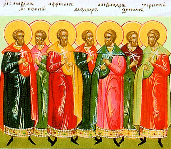총독은 남은 네 명의 성인들에게 신앙을 버리라고 끈질기게 회유했지만 실패했습니다. 이에 총독은 그들에게 무거운 쇠사슬을 채워 감옥에 가두었습니다. 다음 날 밤, 하느님의 천사가 나타나 그들의 사슬을 풀어주며 하늘의 위로를 전해주었습니다. 감옥에서 새어 나오는 찬란한 빛에 놀란 간수들이 들어가 보니, 죄수들은 차꼬가 풀린 채 기쁨에 넘쳐 있었습니다. 두려움에 떨며 도망쳐 나온 간수들은 이 모든 사실을 총독에게 알렸습니다. 이후 며칠 동안 혹독한 고문을 가한 끝에, 총독은 마침내 그들의 목을 베어 죽였습니다. 신자들에 의해 엄숙히 매장된 이 성인들의 시신은 4세기에 콘스탄티노플로 옮겨졌습니다.