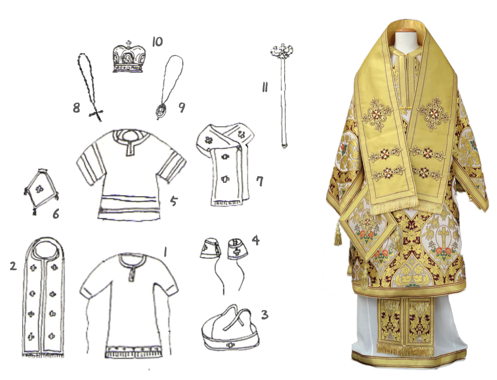 - 에삐마니키온 (수대) - 강함과 순종을 상징.(그리스도께서 본디오 빌라도 앞으로 끌려가실 때 손을 묶인 것처럼) 그리스도를 섬길 준비를 한다는 의미가 있다.