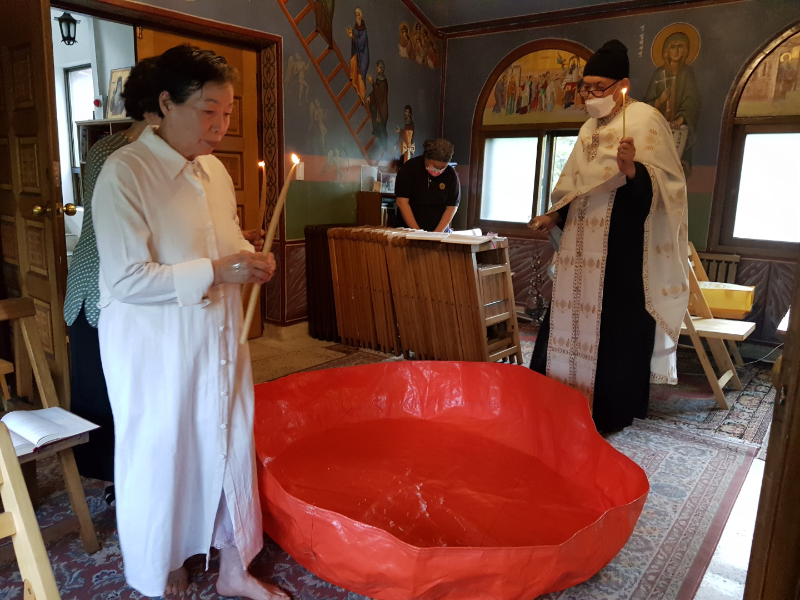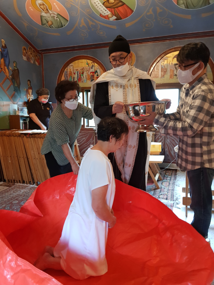 세례성사는 믿음을 받아들인 사람이 물속 깊숙이 세 번 침수함으로써 원죄와 세상에서 지은 모든 죄를 용서받고 영적인 사람으로 다시 태어나 새 삶을 살아가기 시작하는 것입니다. (이번에는 세례 예비자의 건강 문제로 약식으로 진행되었습니다.)