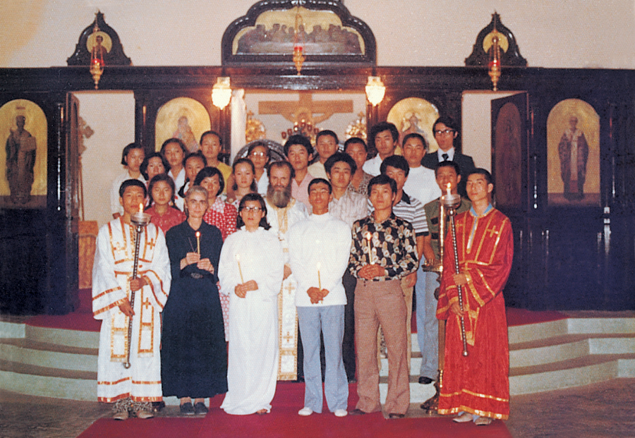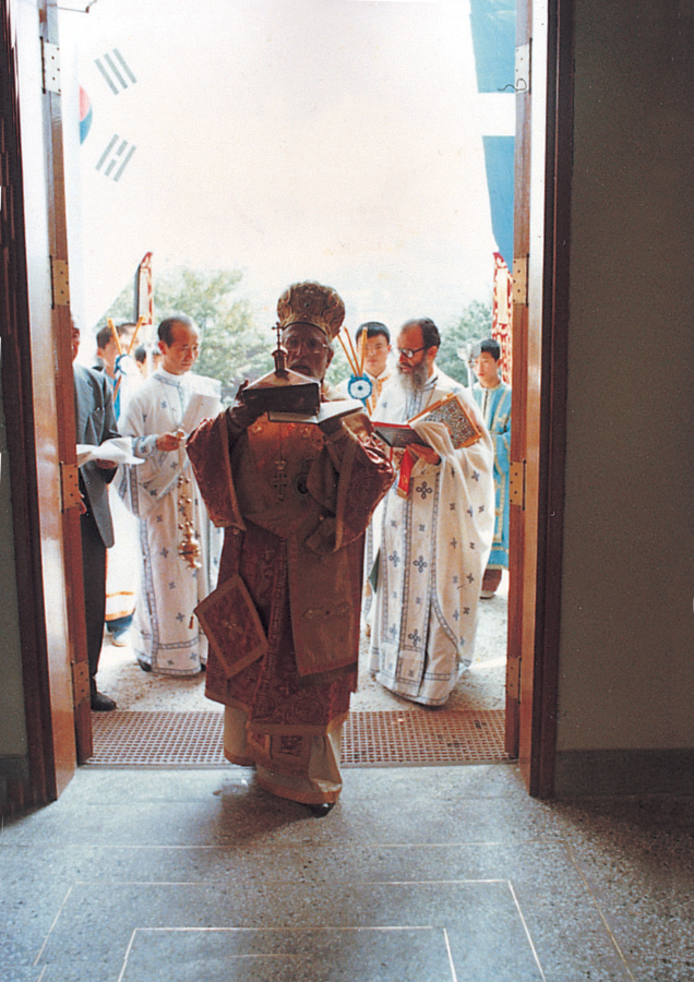 서울 성 니콜라스 대성당의 축성식에서, 당시 한국 교회의 위임 대주교였던 디오니시오스 대주교가 제일 앞에서 성해 (聖骸)를 모시고 들어오고 있다. (1978, 9, 24)