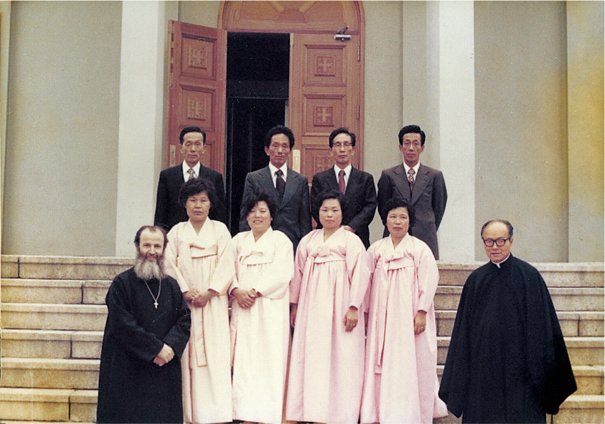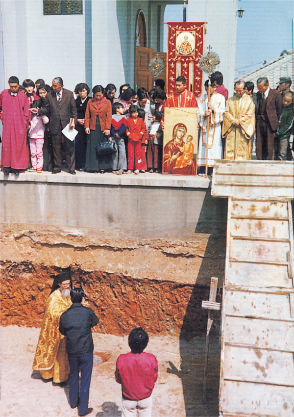 서울 성 니콜라스 대성당의 축성식에서, 당시 한국 교회의 위임 대주교였던 디오니시오스 대주교가 제일 앞에서 성해 (聖骸)를 모시고 들어오고 있다. (1978, 9, 24)