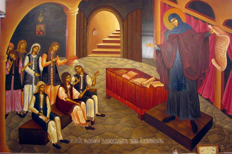 삼 년 뒤 남편이 죽자, 성녀는 결혼의 굴레에서 벗어나 부모님과 함께 생활하면서 기도와 금식에 열중함으로써 하느님을 기쁘시게 하는 일에 자신을 온전히 바쳤다. 다시 십 년 뒤 부모님들마저 돌아가시자 성녀는 자신이 물려받은 막대한 재산을 다 들여 수녀원을 세우는 일에 썼다. 성녀는 한 환상 중에 첫 사도 안드레아 성인이 나타나 보여준 가르침대로 수녀원 설립을 수행하였고, 이 수녀원을 안드레아 사도에게 봉헌하였다.(이 수녀원 자리가 바로 현재의 아테네 대주교좌 성당이 있는 곳이다.) 또한 성녀는 수녀원 곁에 나란히 병원과 가난한 이들, 노인들을 위한 호스피스 시설들, 여러 가지 일터들 그리고 무엇보다도 아테네의 소년, 소녀들이 그리스도교적인 교육을 받을 수 있는 학교 등 온갖 자선 시설들을 건립하였다.