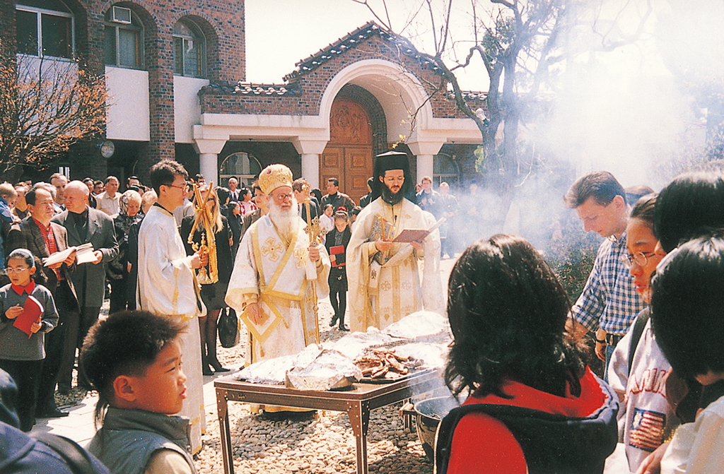 서울 성 니콜라스 대성당에서 거행된 세례성사를 집전하는 소티리오스 주교 (1995)